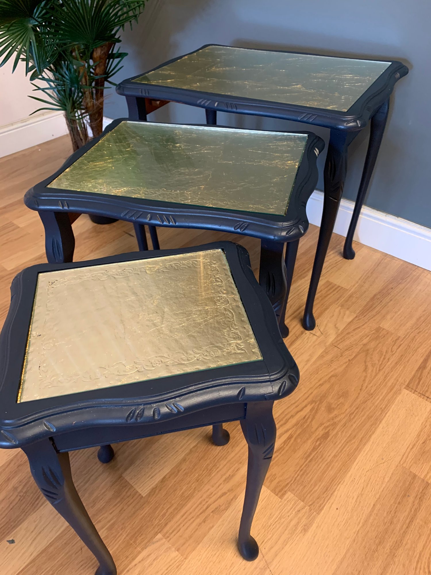 A nest of tables in dark blue & gold leaf.
