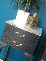 Painted in dark grey with vinyl grey & white marble tops. The edges I have used gold leaf in a distressed look..........