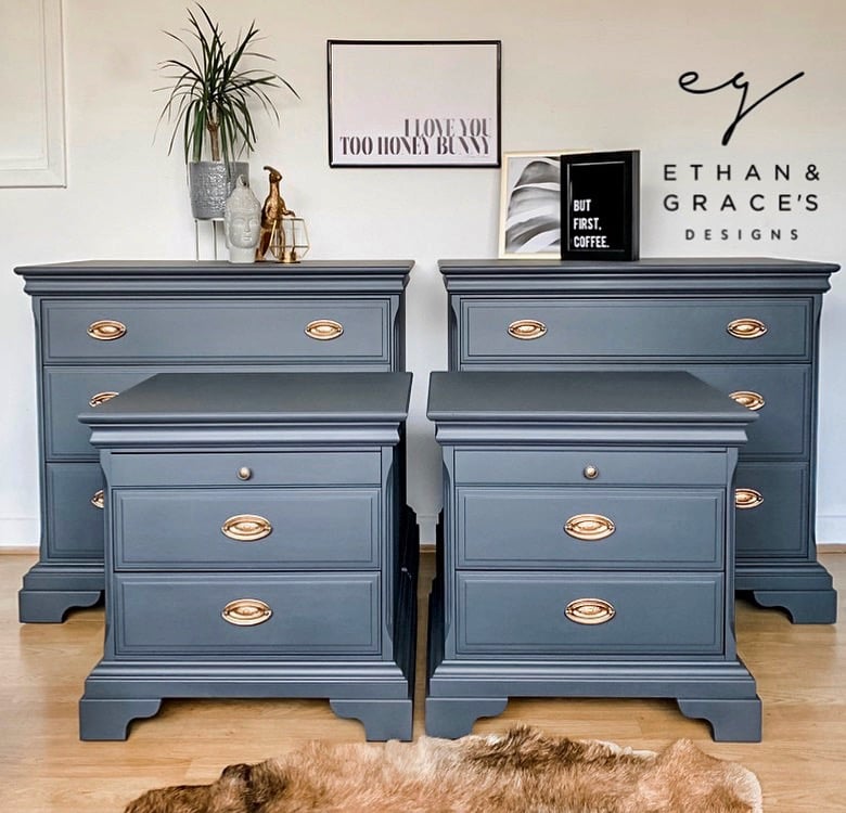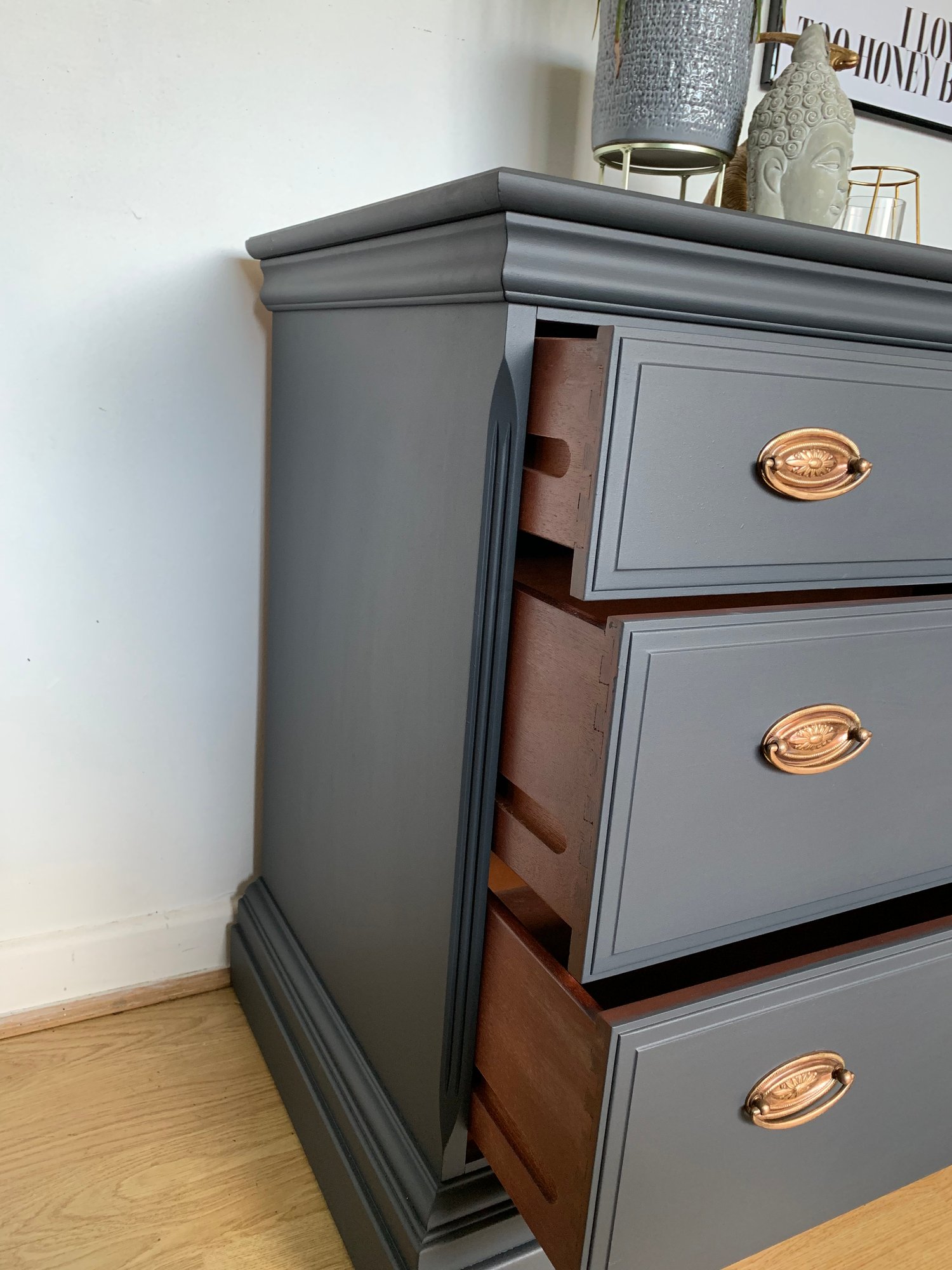Painted in a dark grey and sealed with a Matt varnish. For the hardware I have used an antique gold paste.