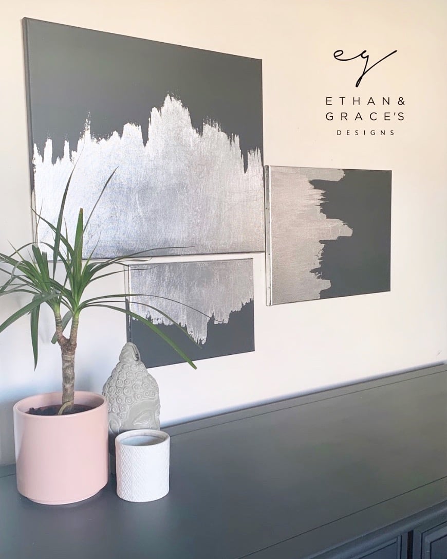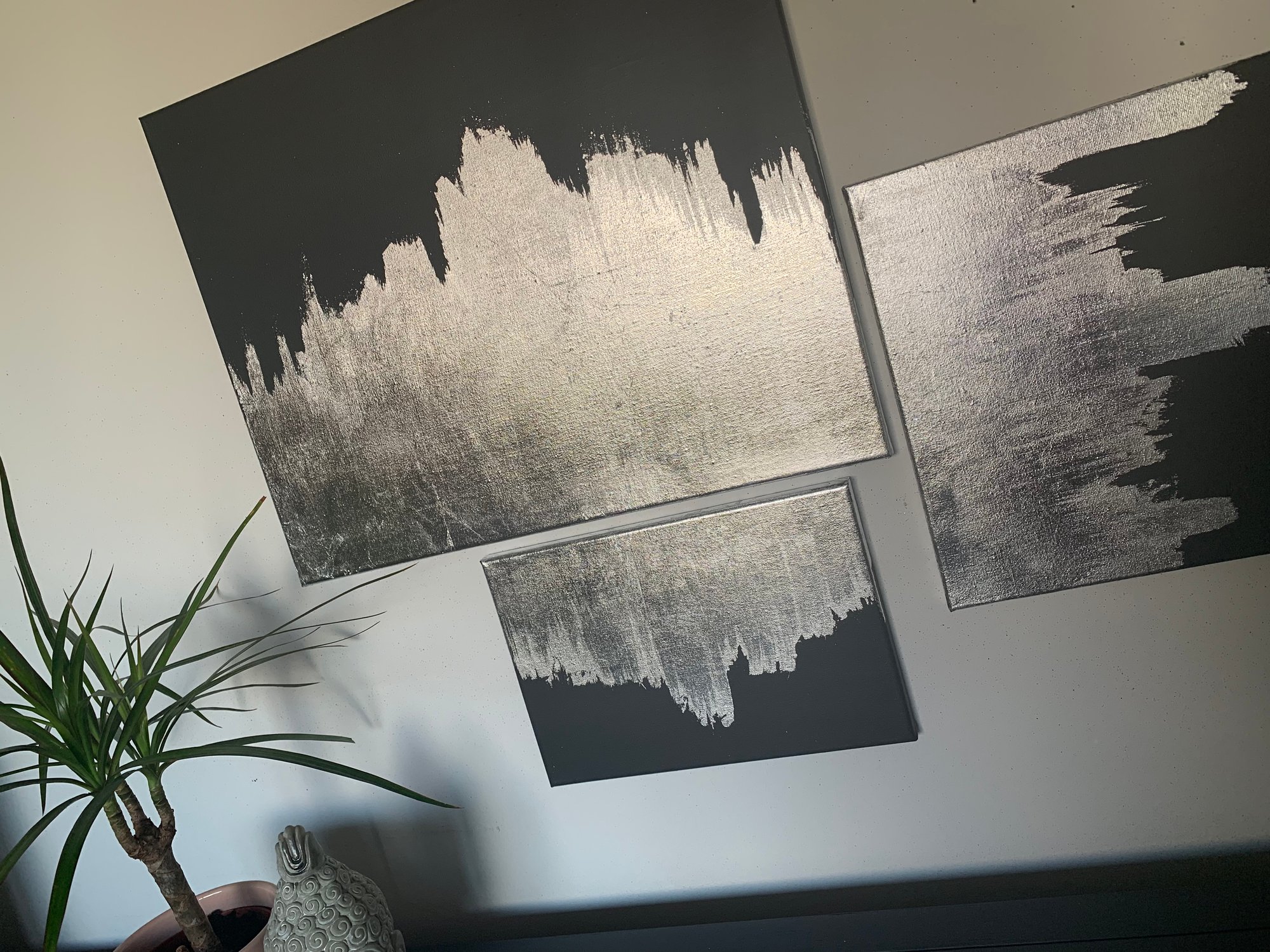 A set of 3 dark grey & silver leaf canvases made by Ethan & Grace’s