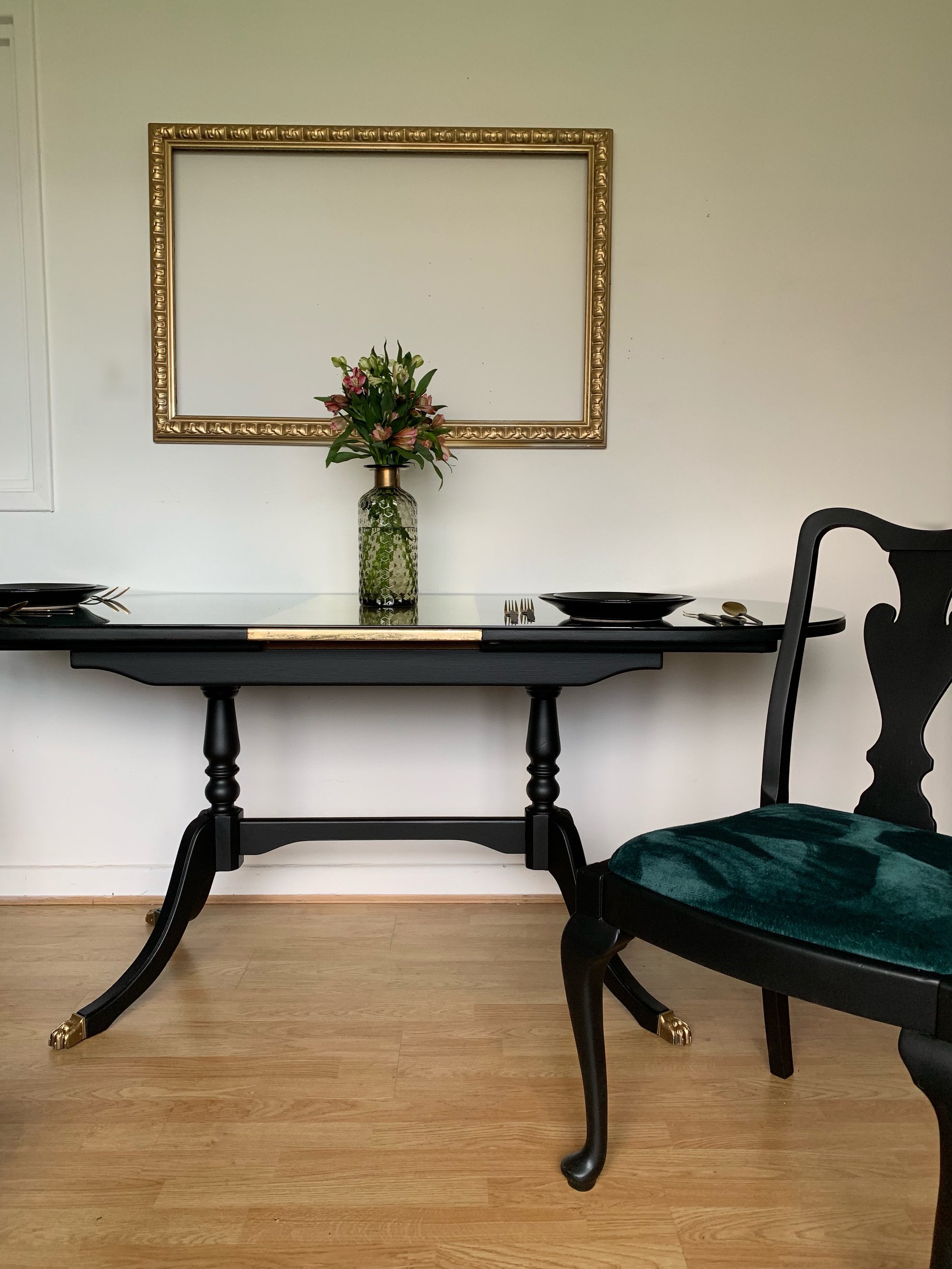 The table has also had a black makeover with layers of paint and rough varnish.