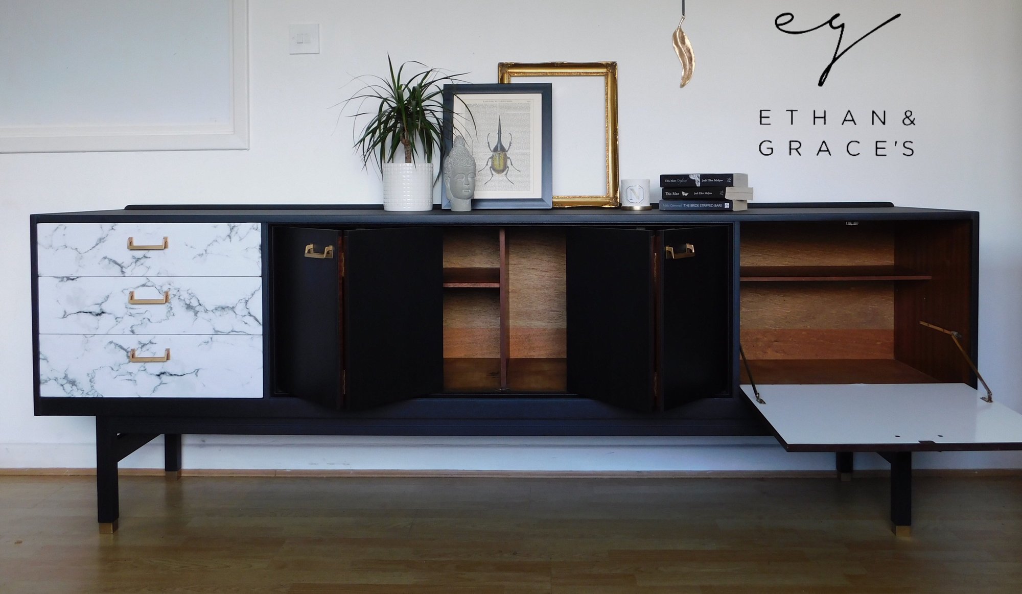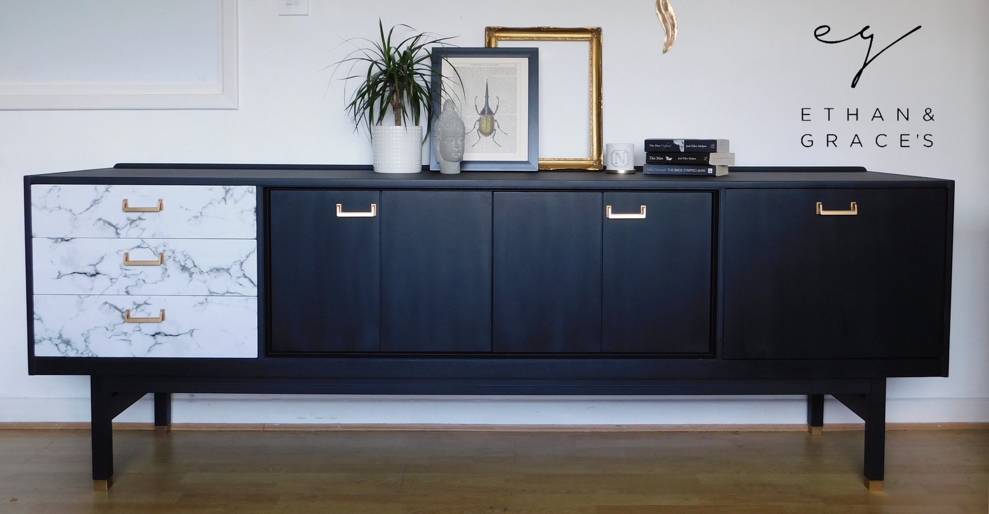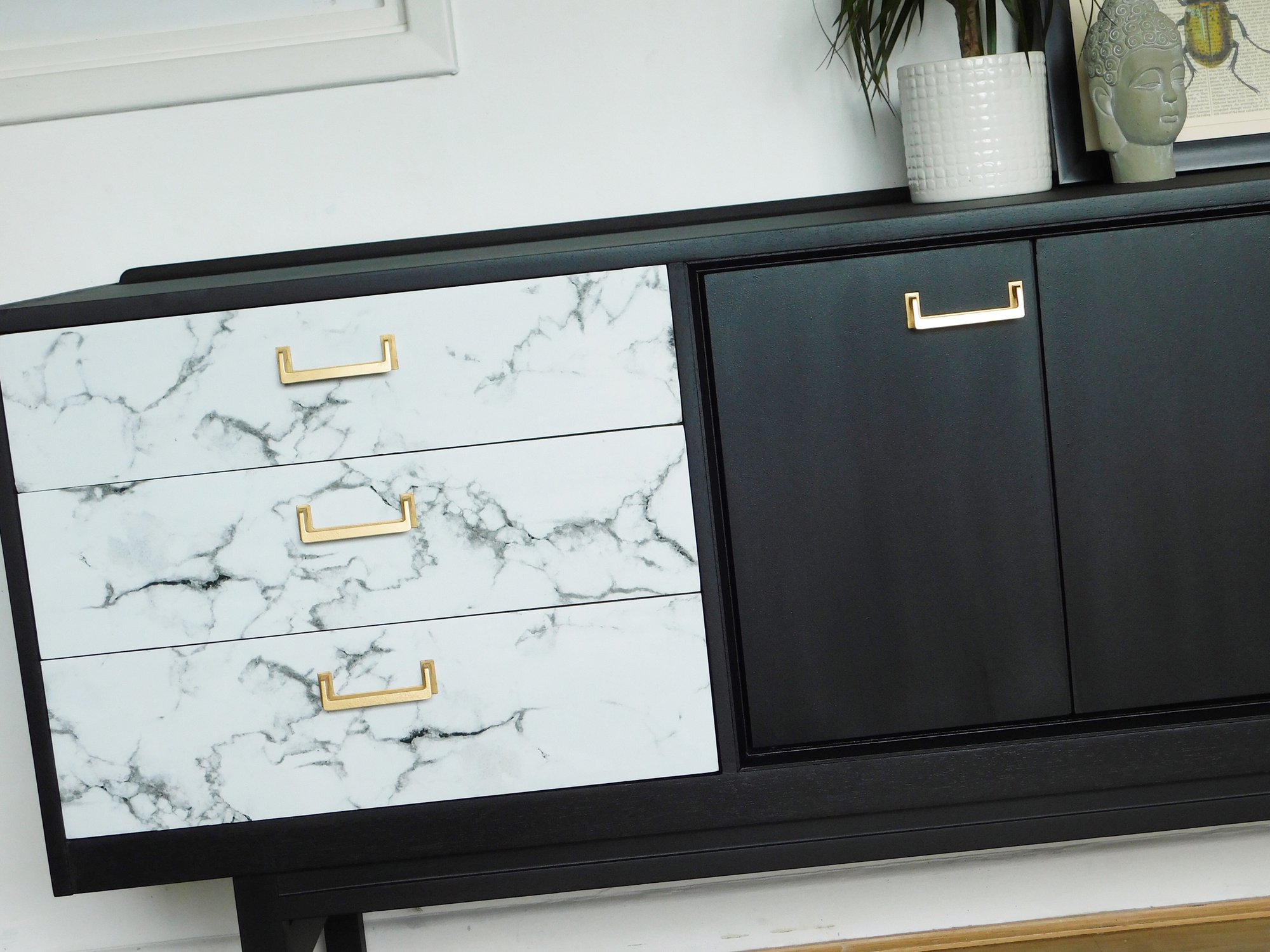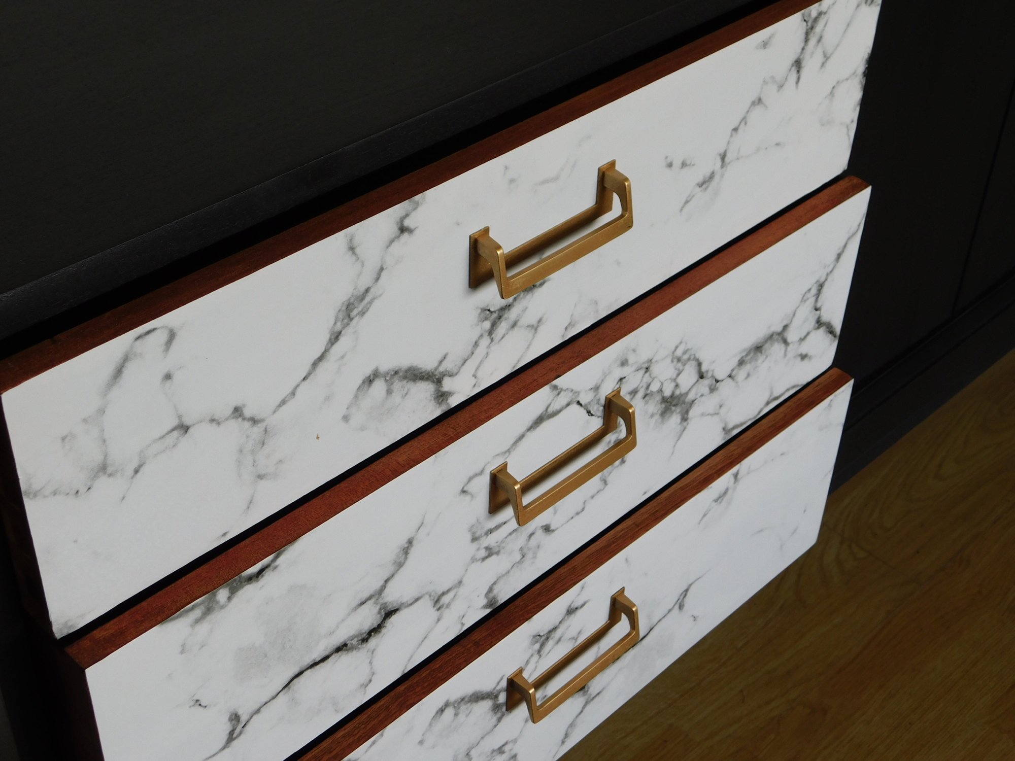 The drawers have been covered in a marble effect pvc and the handles and feet and been given a coat of gold paint.