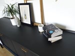 Painted in black with a vertical effect on the front and sealed with layers of varnish to protect.