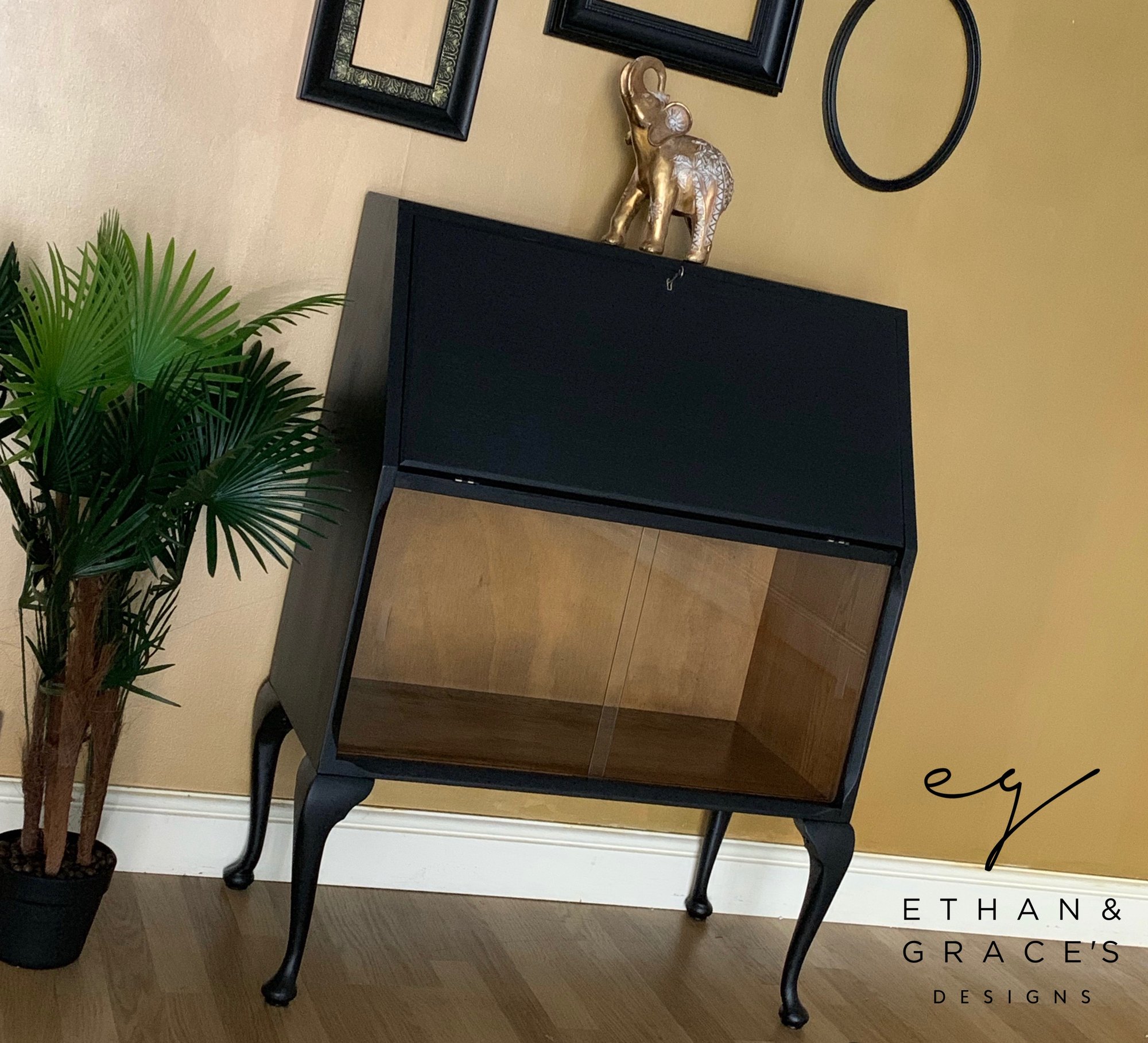 Painted in black with wood behind the glass and gold on the small drawers.