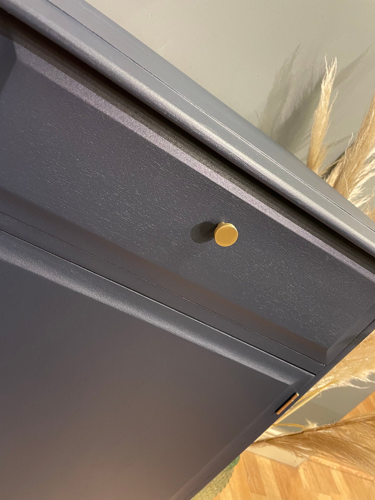 Professionally spray painted in a dark blue with new gold handles