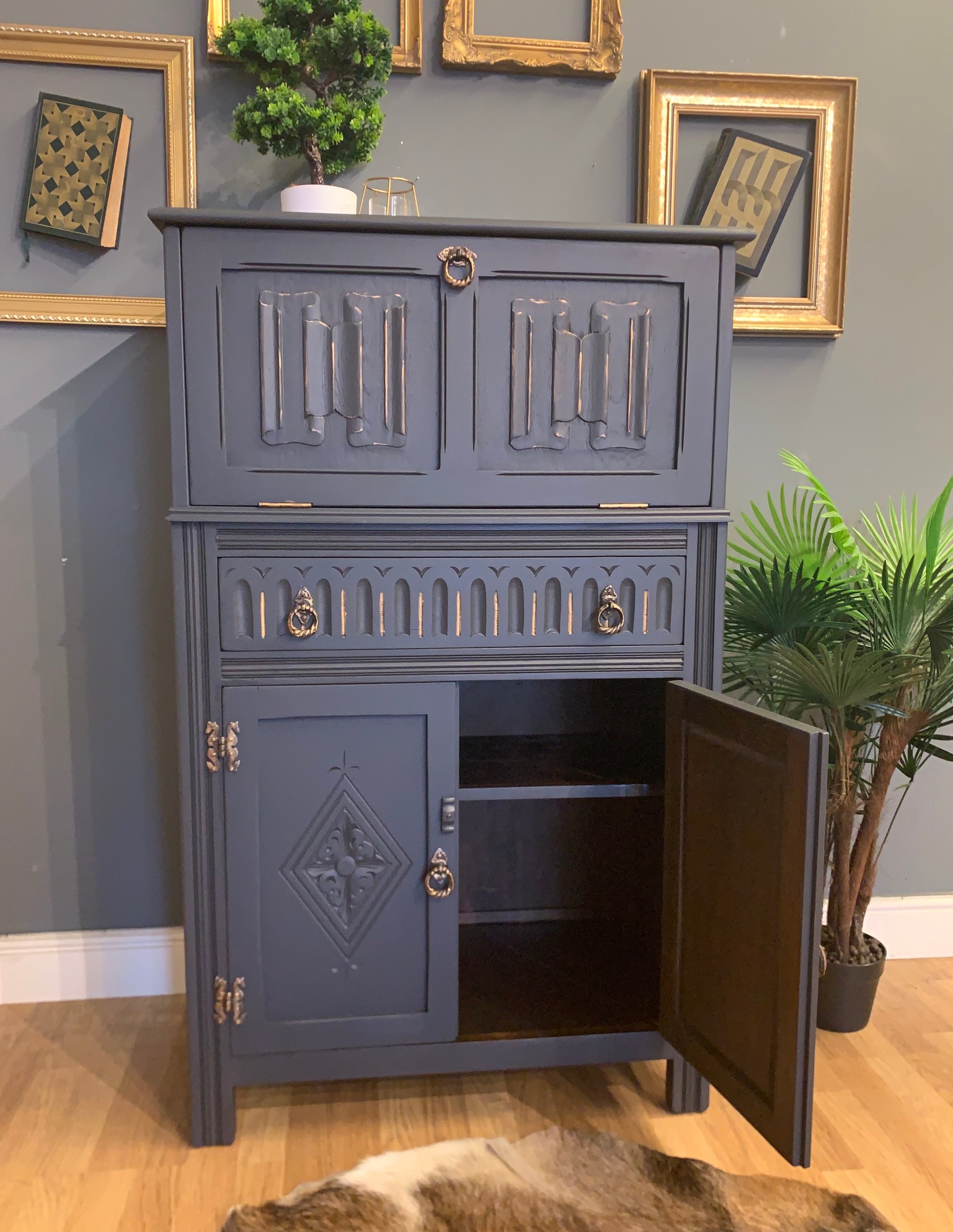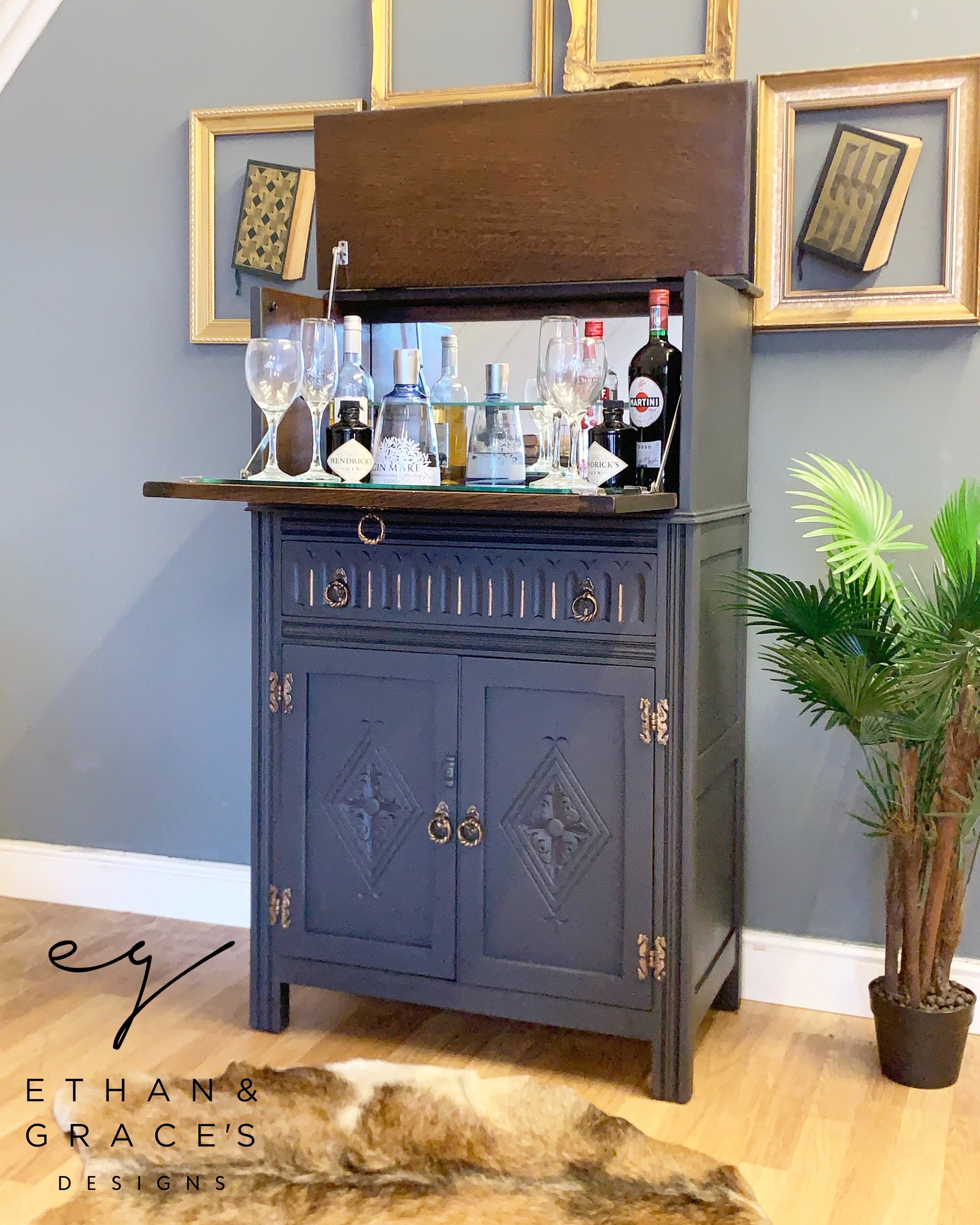 Solid oak drinks cabinet in dark grey & gold.