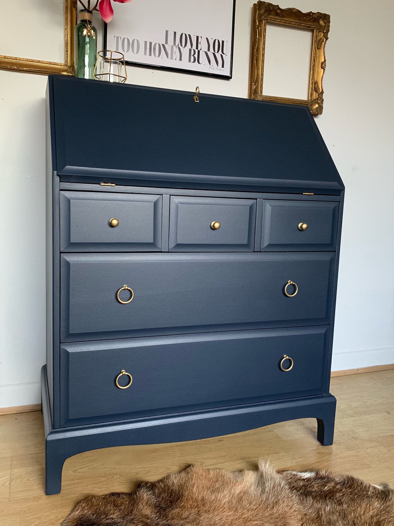 Given a makeover over in a beautiful deep blue with gold hardware.