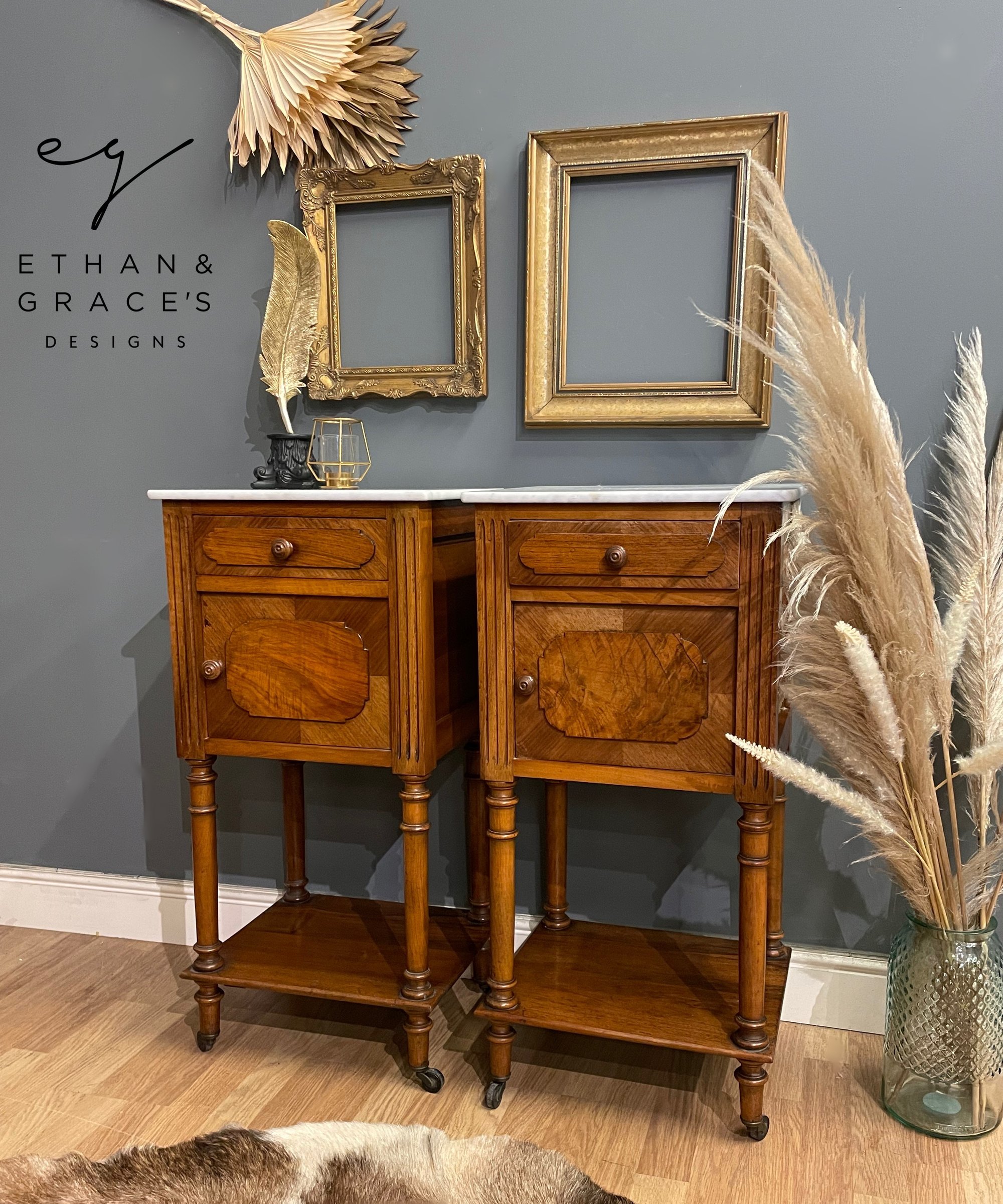 A beautiful pair of french marble oak bedside tables on castor wheels