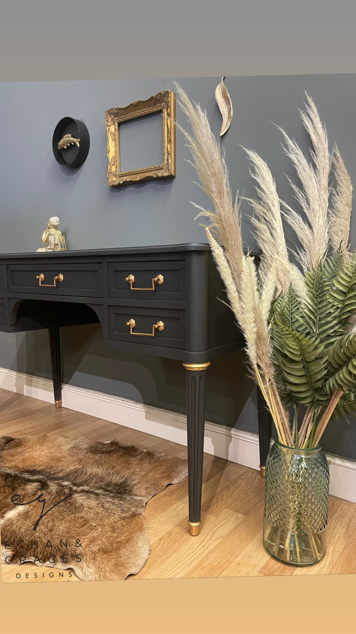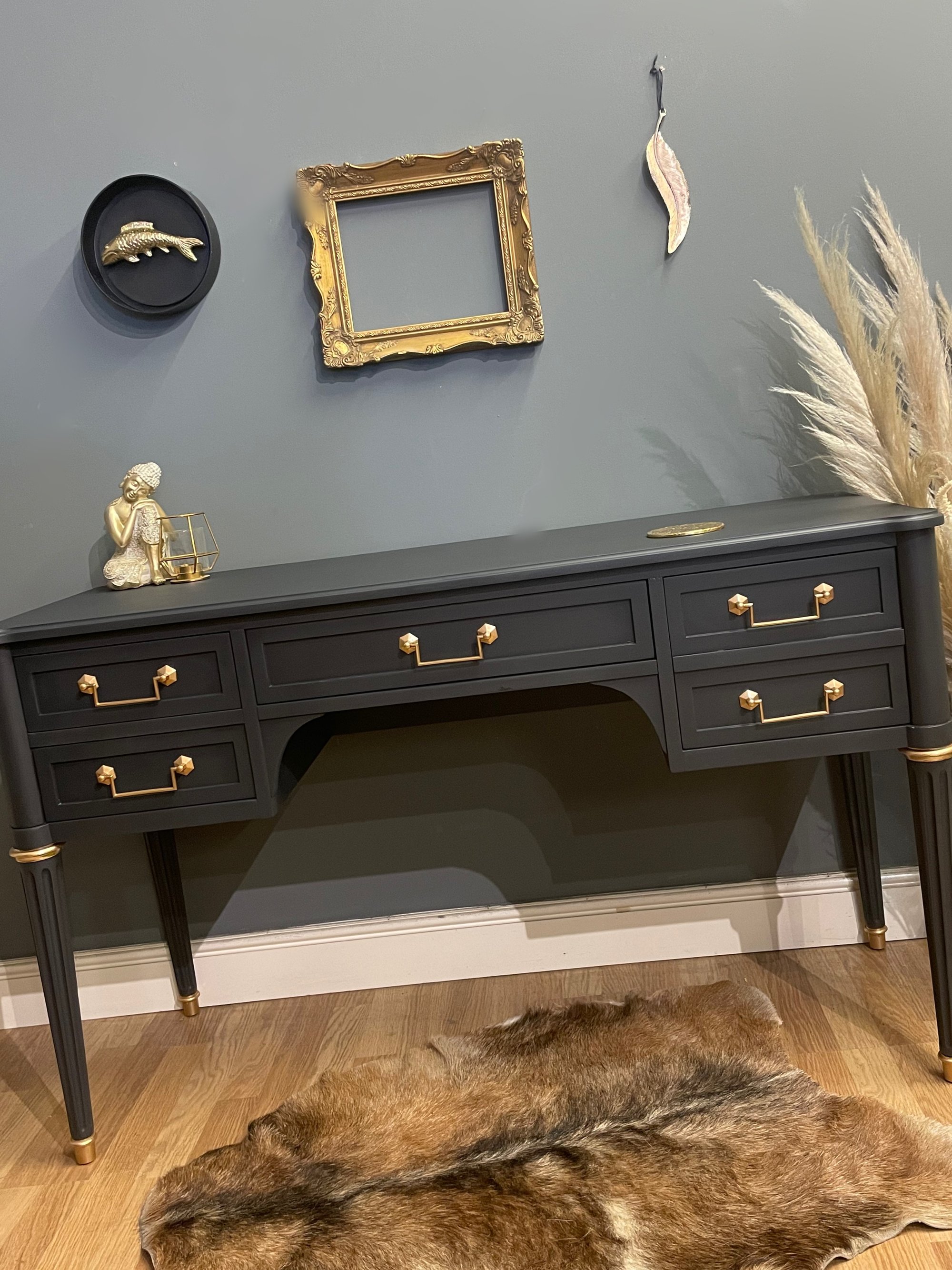 A stunning desk/dressing table in dark grey & gold.